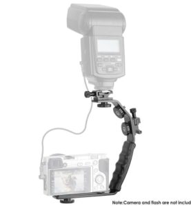 O suporte L da câmera permite conectar uma fonte de luz à sapata, que afasta a fonte de luz da câmera. Isso ajuda a reduzir os olhos vermelhos e reduzir as sombras.